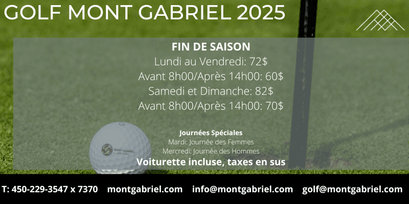 Le golf ne peut être meilleur qu’à l’Hôtel Mont Gabriel. De notre terrain de golf situé sur le sommet de la montagne, vous aurez une vue à couper le souffle sur la vallée des Laurentides, des collines verdoyantes et un riche paysage coloré. C’est une expérience de golf vraiment unique et à couper le souffle que vous ne trouverez nulle part ailleurs au Québec. Le Golf Mont Gabriel est situé à même l’Hôtel & Spa Mont Gabriel, l’un des rares hôtels golf in / golf out au Québec. Construit en 1990, le terrain occupe 212 acres intégrées au Sommet Gabriel. Le parcours a été dessiné afin de tirer parti de la vue panoramique sur la vallée de Saint-Sauveur et des stations de ski environnantes. Le panorama montagneux offre des vues à couper le souffle et entraîne l’utilisation obligatoire d’une voiturette afin d’optimiser le temps de jeu. Par conséquent, tous nos tarifs incluent la voiturette.